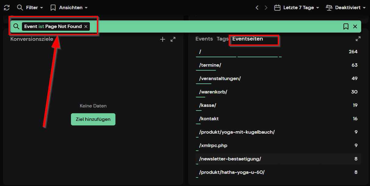Recently, the “Page not found” event has been appearing very frequently in our statistics. I filtered for this event and looked at the event pages, and I’m surprised because all the listed pages exist and can be accessed without any problems.